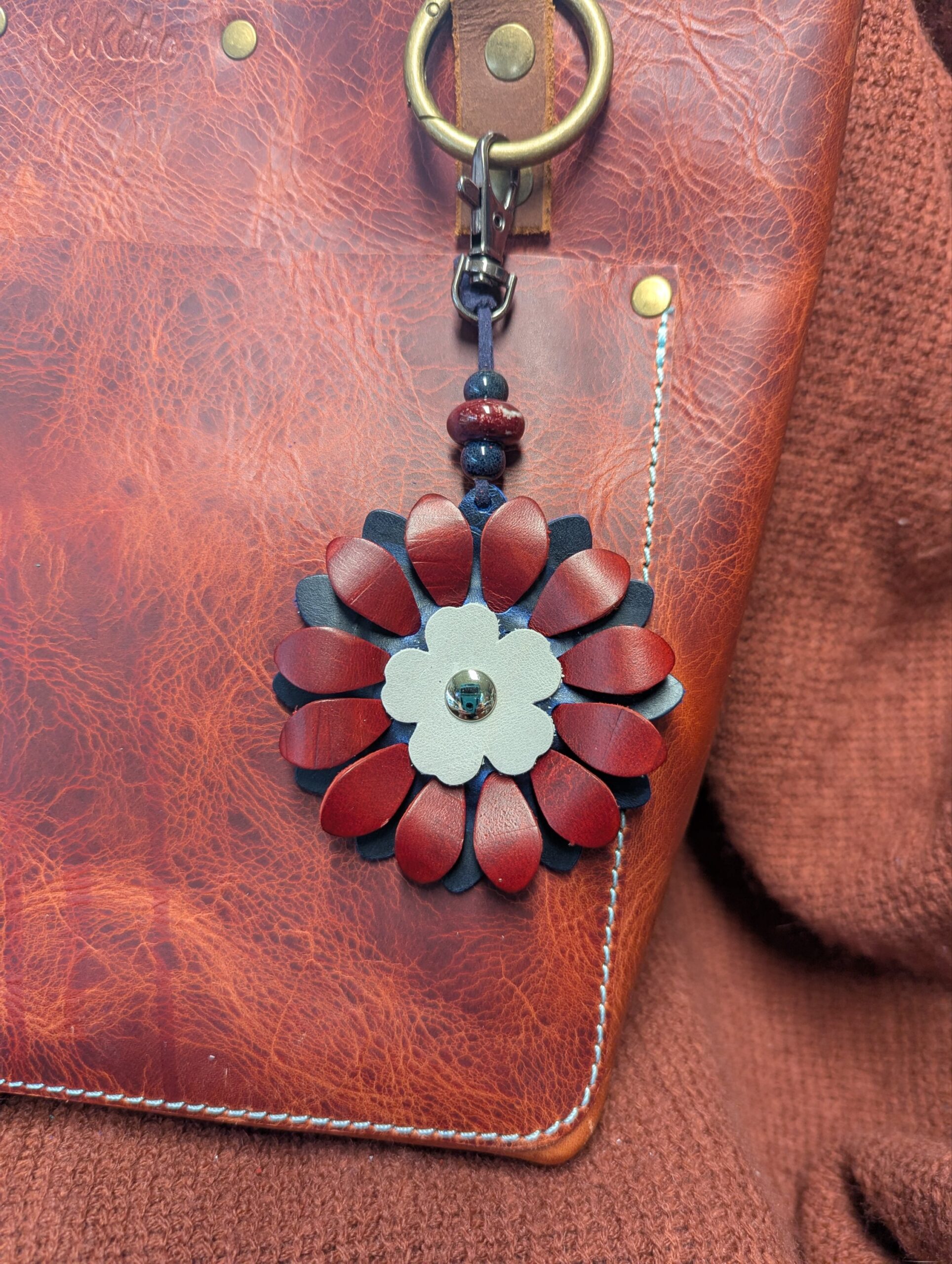 #289A- New Flower Power Purse Charm. Made with a set of two SoRetro leather flower petal layers, a center leather flower piece and I then suspended it with a beautiful set of lampwork and ceramic or wooden beads on a lovely clasp. All in red, white and blue. The hardware used on this charm will be ant. bronze.