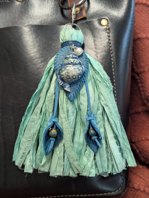 In this Dazzle Designs Jewelry sari silk purse charm, I have added a handcrafted ceramic seashell from Anne Curley’s unique collection. This is a one of a kind creation and cannot be duplicated. It’s handcrafted to blend elegance with quality and individuality; made with premium materials, full grain leathers, and eye-catching details, these charms elevate any handbag with a touch of sparkle and style.