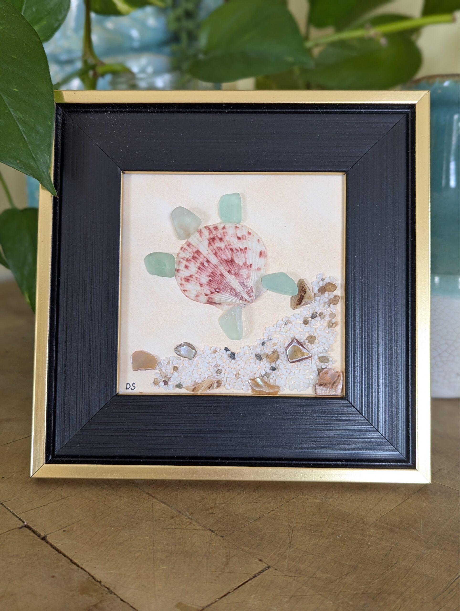 6.5 x 6.5 framed turtle hatchling looking for the sea with a sandy beach in the foreground. Hand painted soft subtle background!