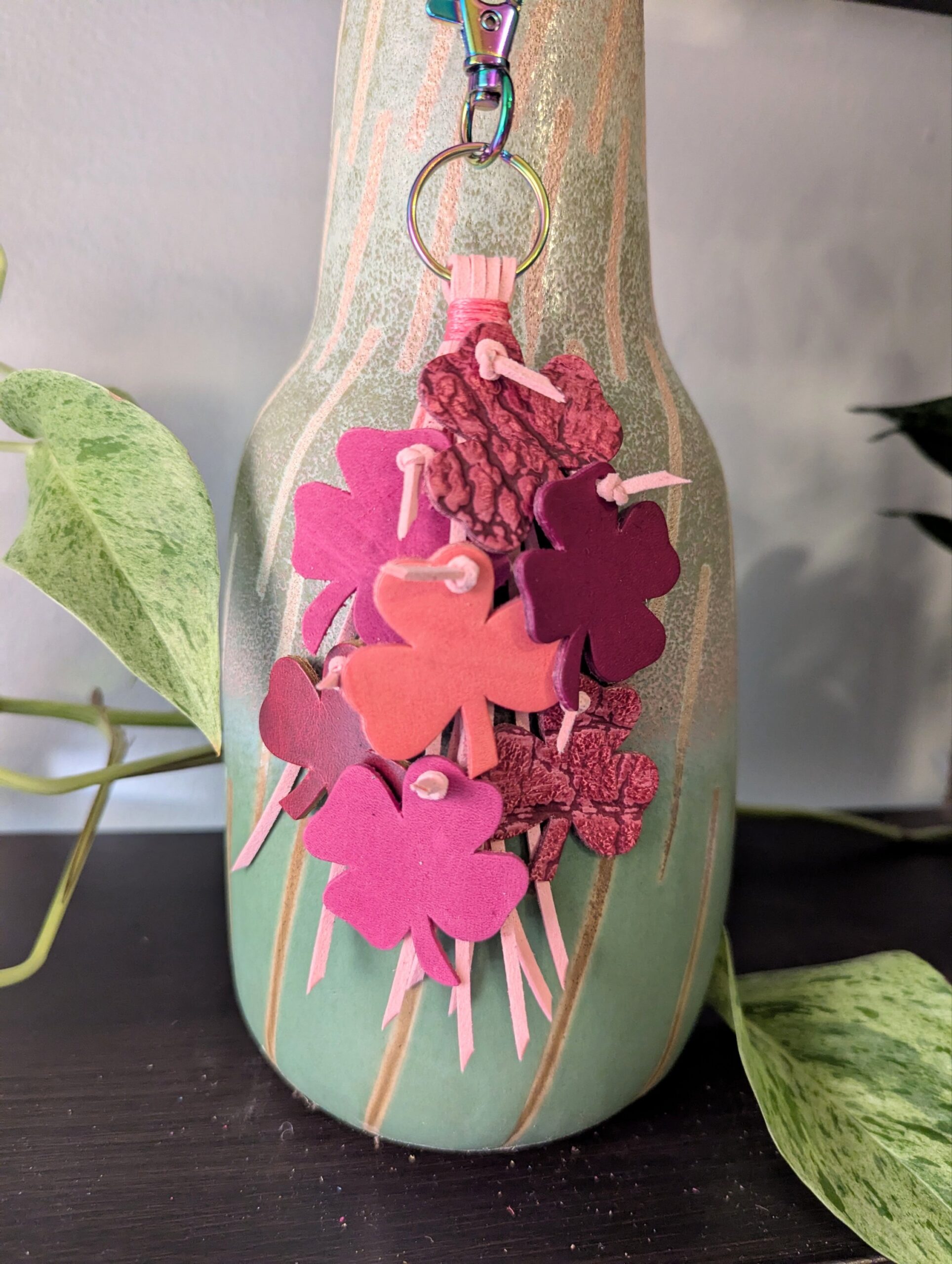 #644 “Shamrock Time in Pink” Leather Purse Charm Tassel is made using beautiful 3 and 4 leaf SoRetro leather clovers suspended on a vegan suede purse charm tassel. I used chromalusion (rainbow) hardware. Approx. length is 6.5-7 inches.