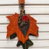 “Squirrel on a Branch and Acorns” Purse Charm .  A sweet little bronze squirrel on a branch surrounded by acorns!  All suspended on three hand cut SoRetro leather leaves.  This purse charm is made with bronze hardware and a beautiful glazed ceramic bead and 2 wooden beads above the pendant!  You will love the beautiful colors of this Fall creation!