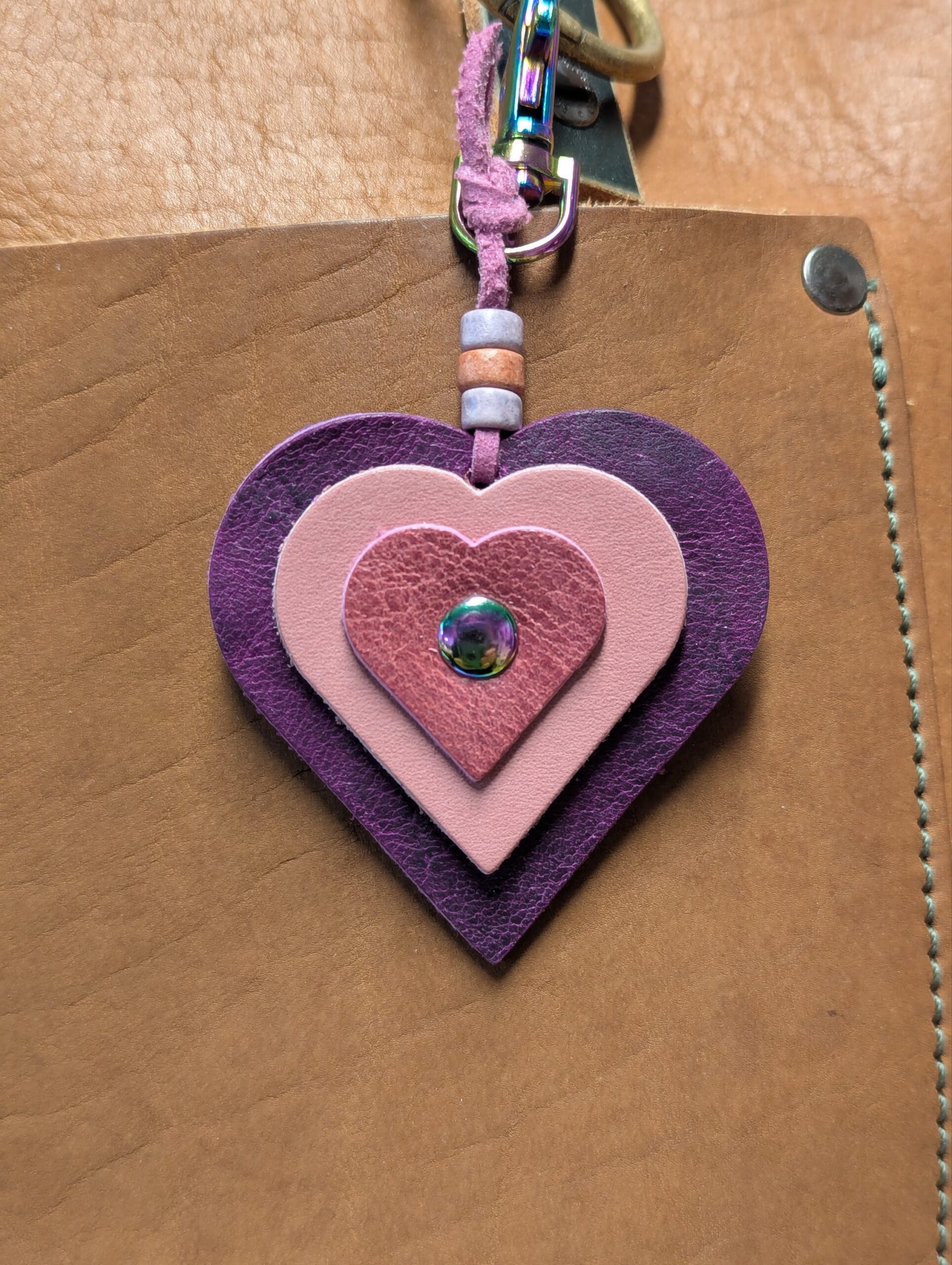 #594- A sweet trio of mini SoRetro leather hearts with beads and chromalusion hardware.