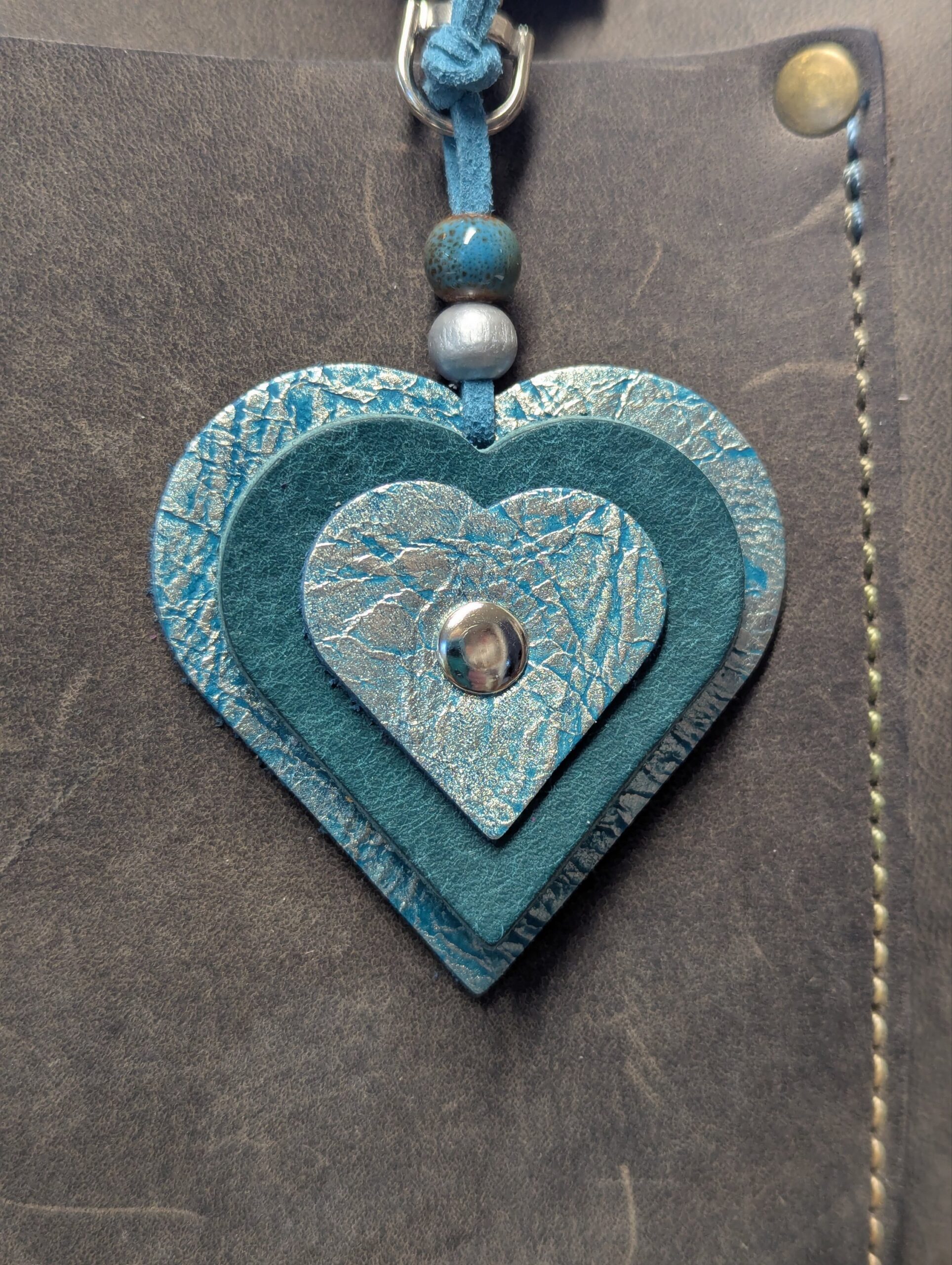 #596- A sweet trio of mini SoRetro leather hearts with beads and silver hardware.